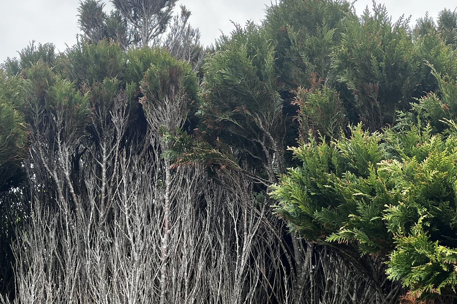 21st April: Some conifers with bare dead looking wood stems but bushy green tops.