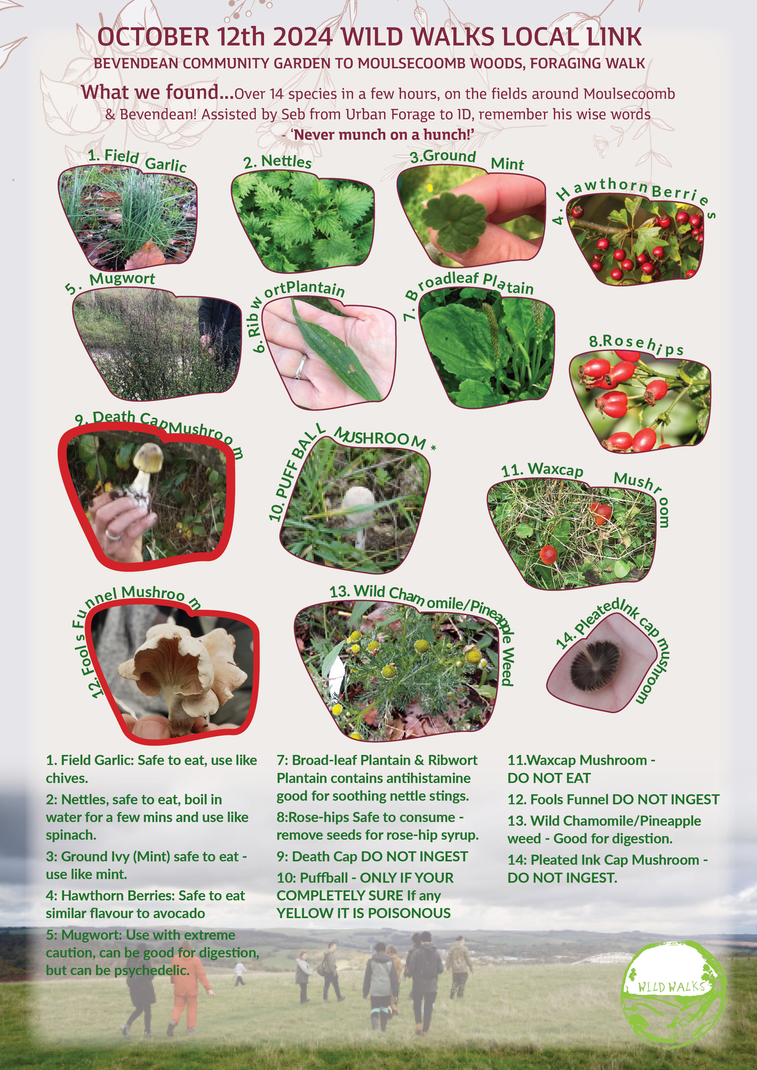 Seb from Urban Forage was our guide on the first Wild Walk. This was a 1.7 mile walk which took us from Bevendean Garden up through Bevendean Down, past the underground reservoir and round the edge of Hogtrough Bottom, then along through the fields besides Moulscoomb along the edges of Wheatfield way and above north Moulsecoomb, with the walk ending just above Ashurst Road.
