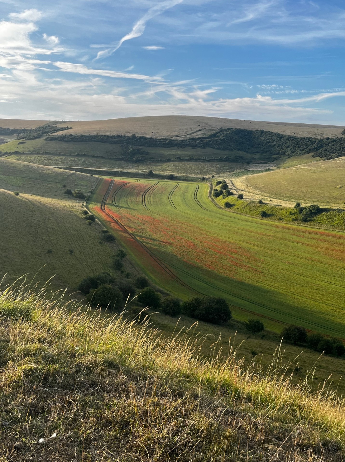 This area is characterised by rolling chalk hills. The landscape includes prominent downland ridges, such as Firle Beacon, which mark the highest elevations of the South Downs. The soft, permeable chalk of the region facilitates well-drained, nutrient-poor soils, supporting unique habitats such as chalk grasslands and woodlands.